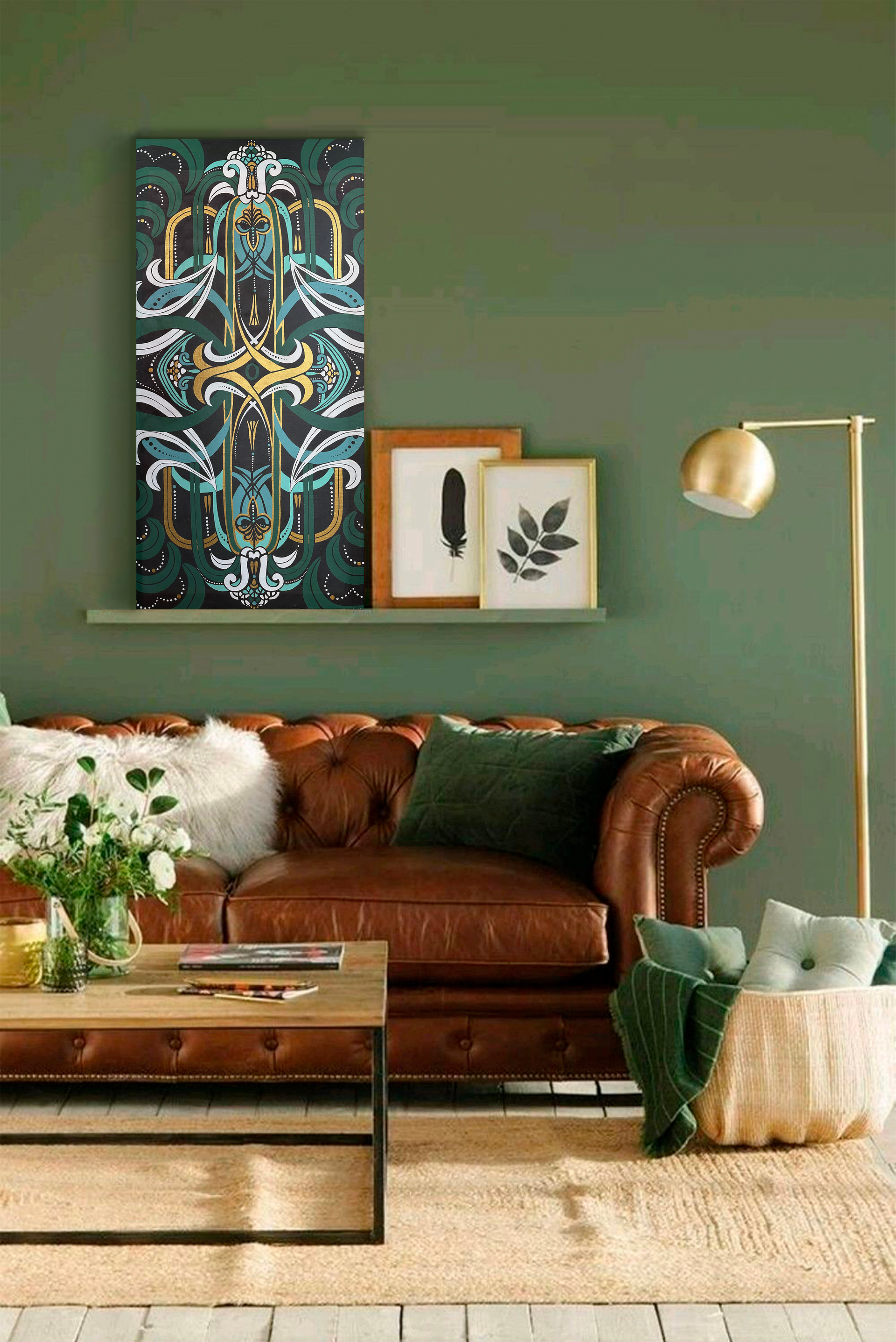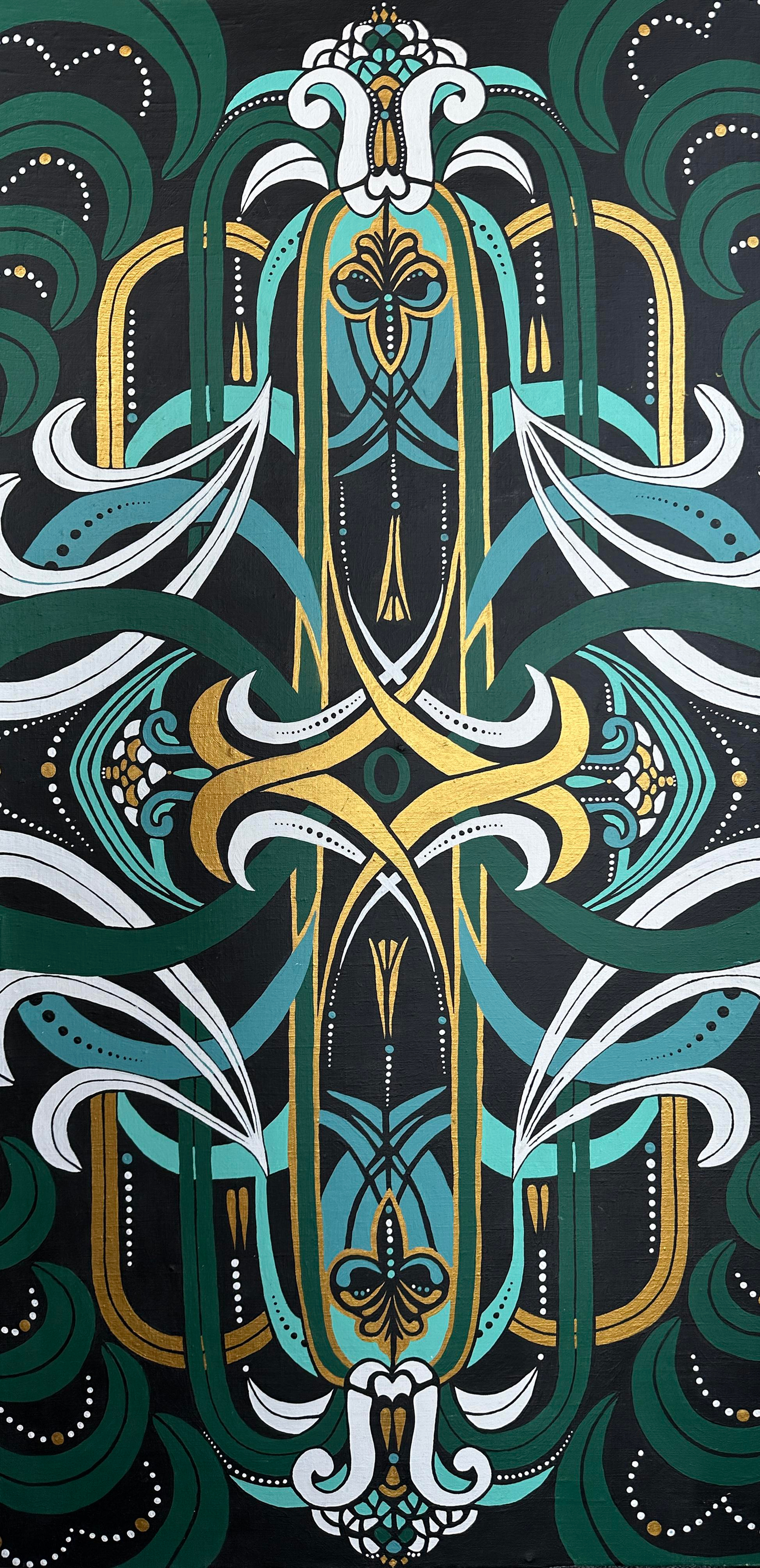 В данном изображении используются природные цвета. Благородны зеленый цвет, отсылает нас к близкой связи с природой, а точнее фауной. Белые и светлые оттенки зеленого связывают с ветром и движением, поэтому именно эти формы являются самыми динамичными в картине. Золото — это благородный металл, который добывается из недр нашей земли и символизирует мудрость и ее тайны.