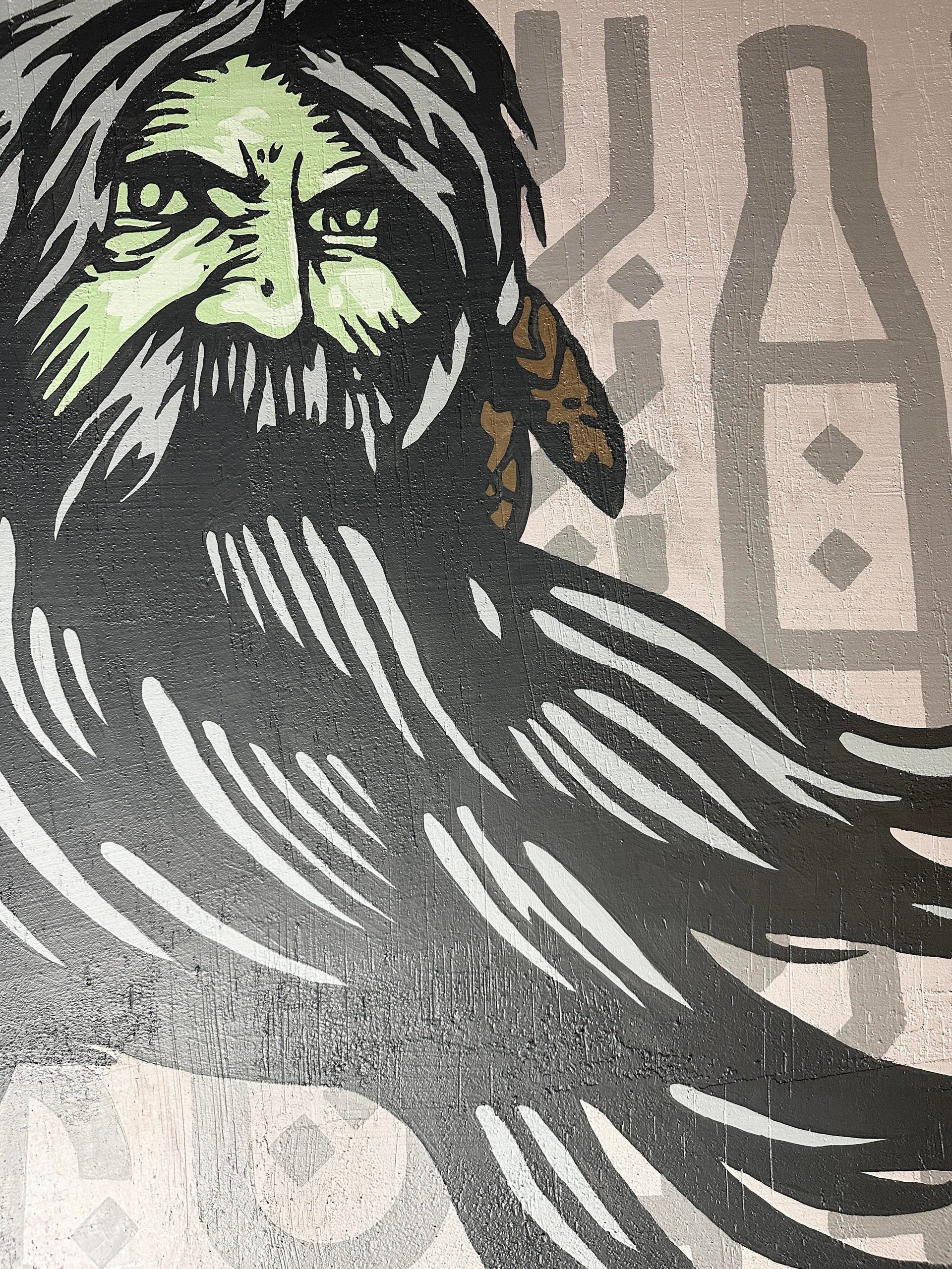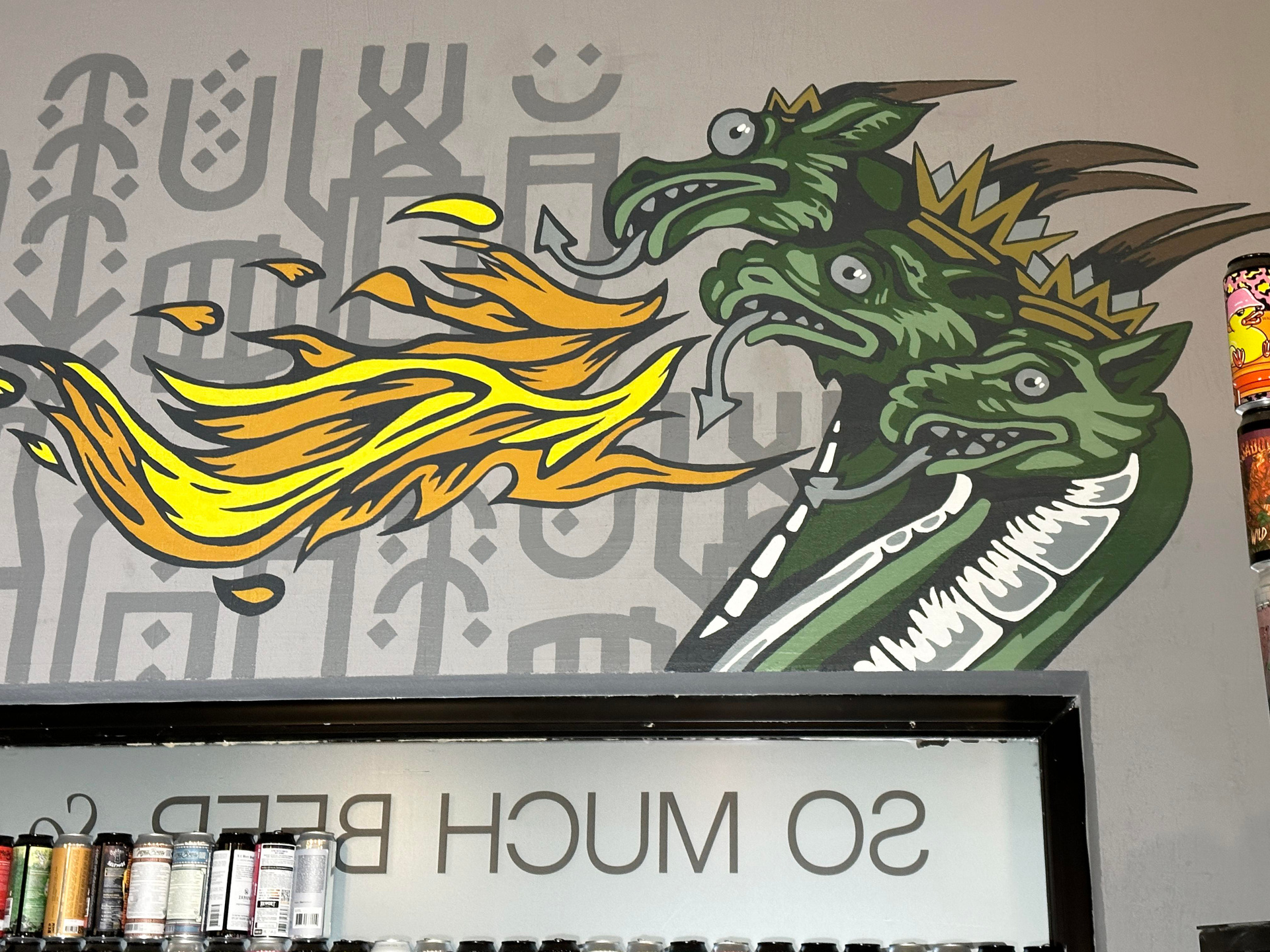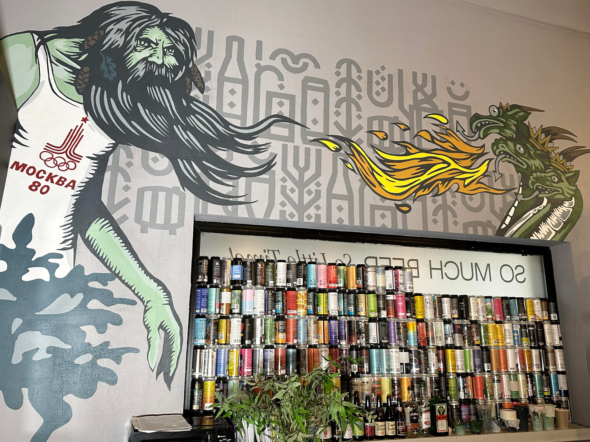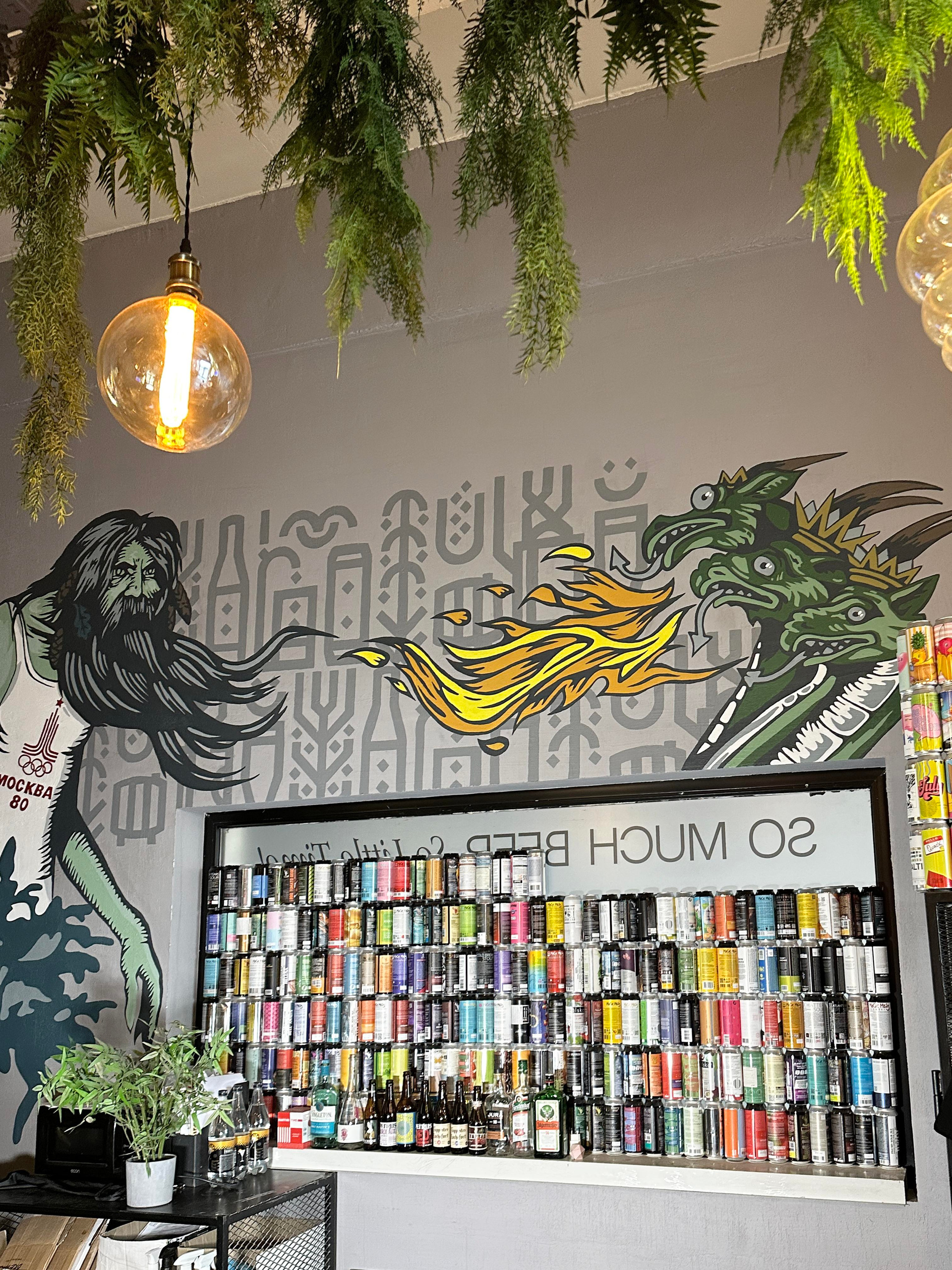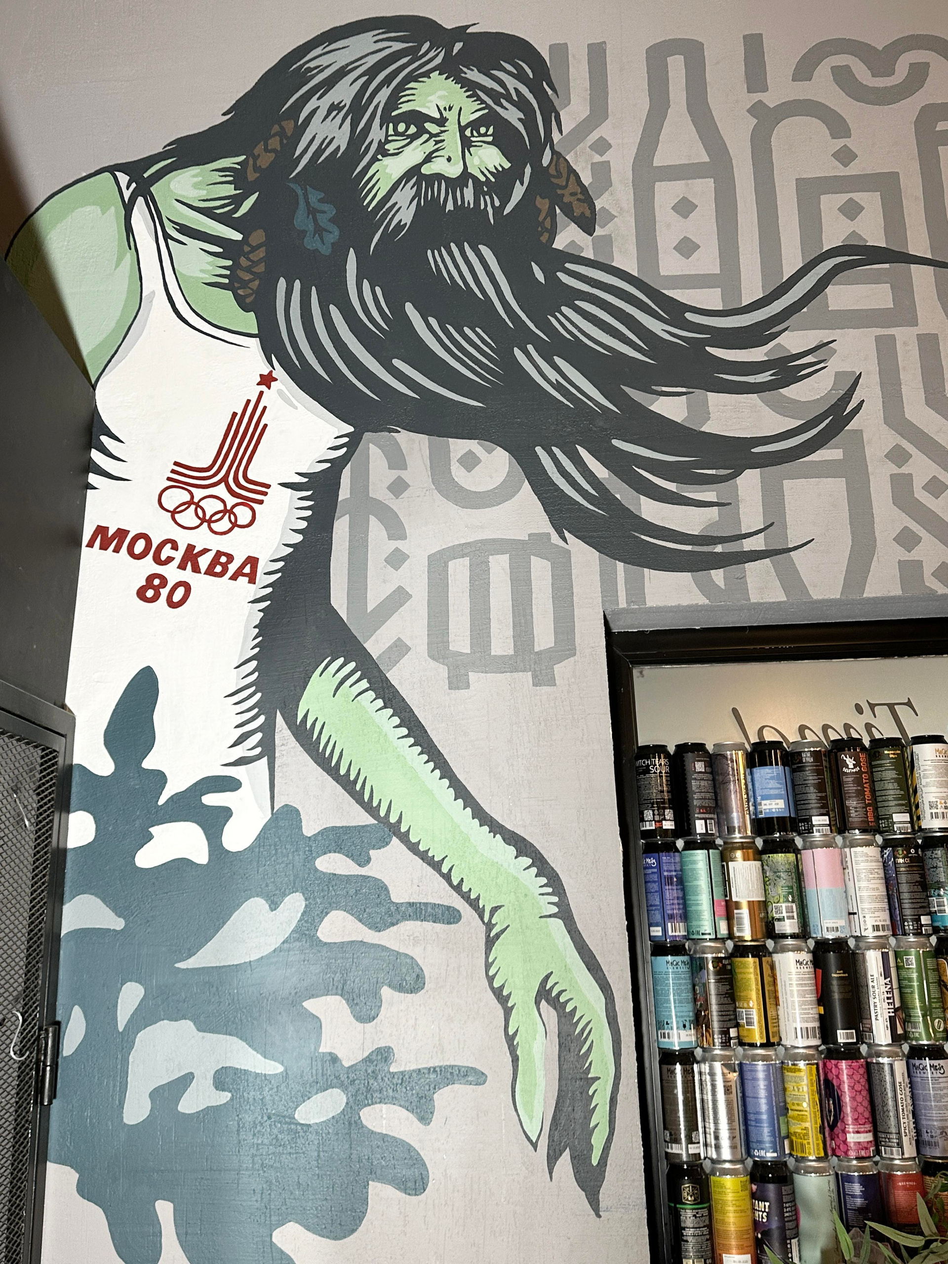 Роспись для бара ONETAP в городе Санкт-Петербурге в пространстве Севкабель порт по адресу Кожевенная линия, 34. Для росписи были выбраны персонажи пивоварни Brewlok из Воронежа. Они известны своей продукцией направленной на сказочную литературную тематику. Для акцентного изображения были выбраны два популярных персонажа Леший и змей Горыныч. А фоновым рисунком декоративный паттерн о процессе пивоварения.