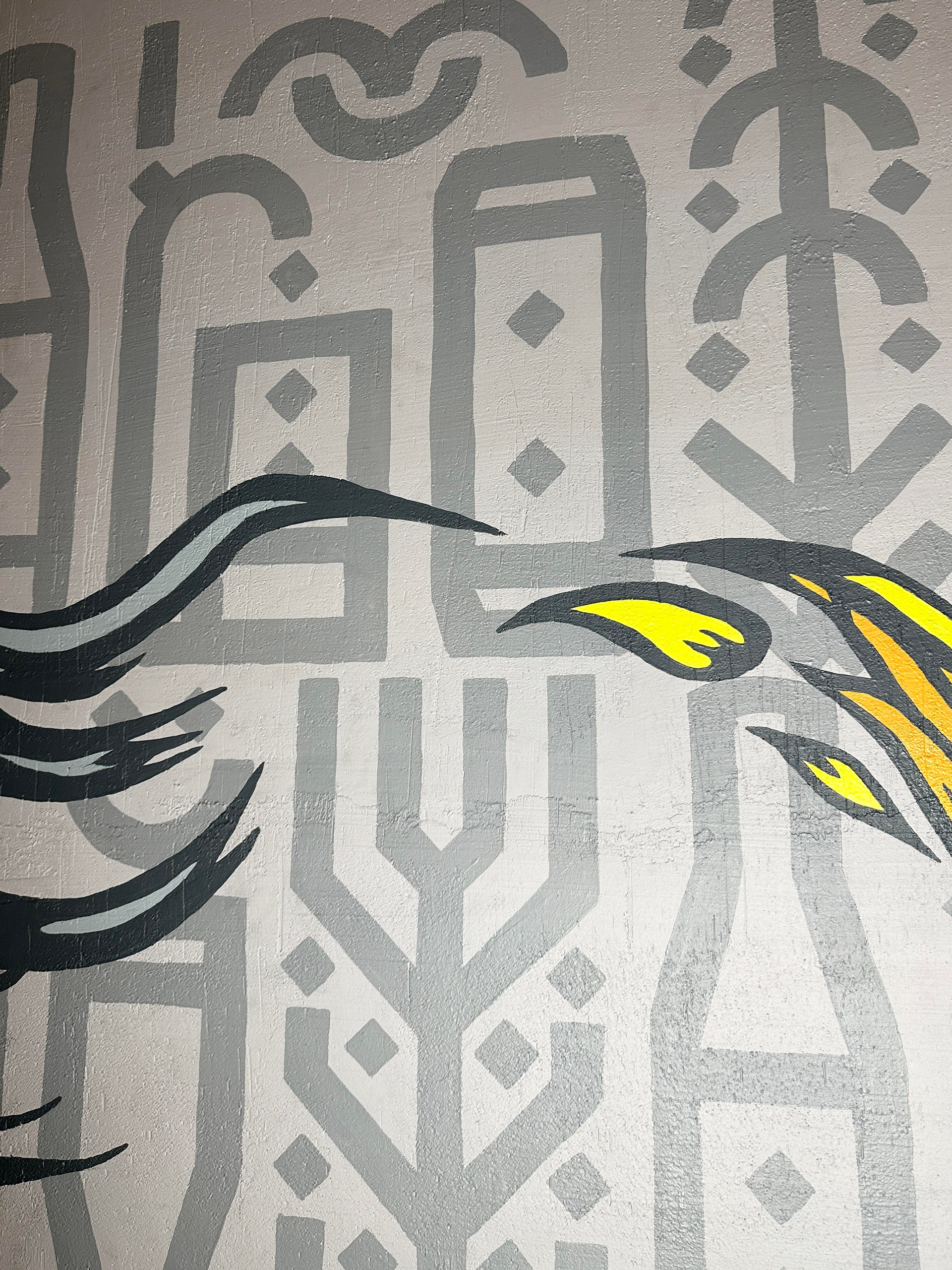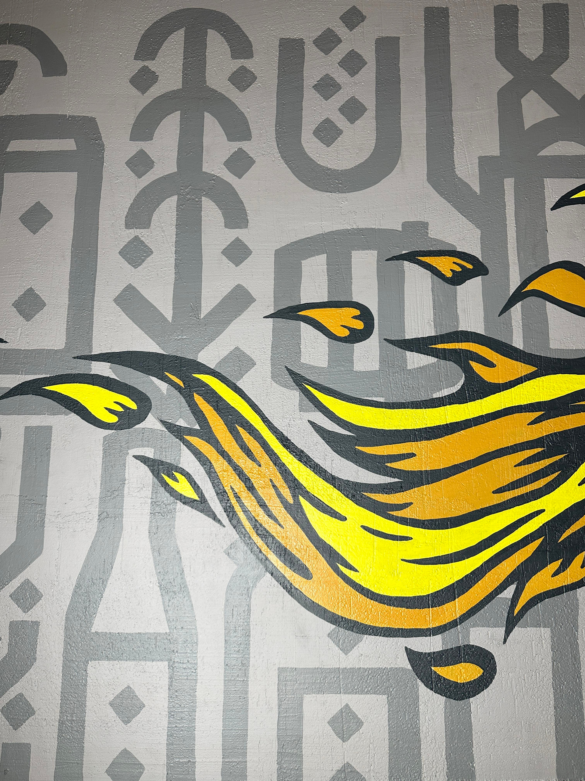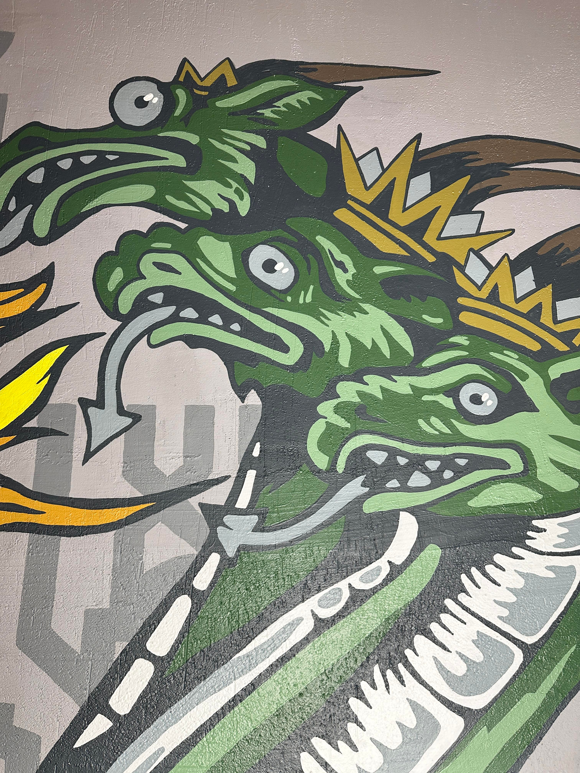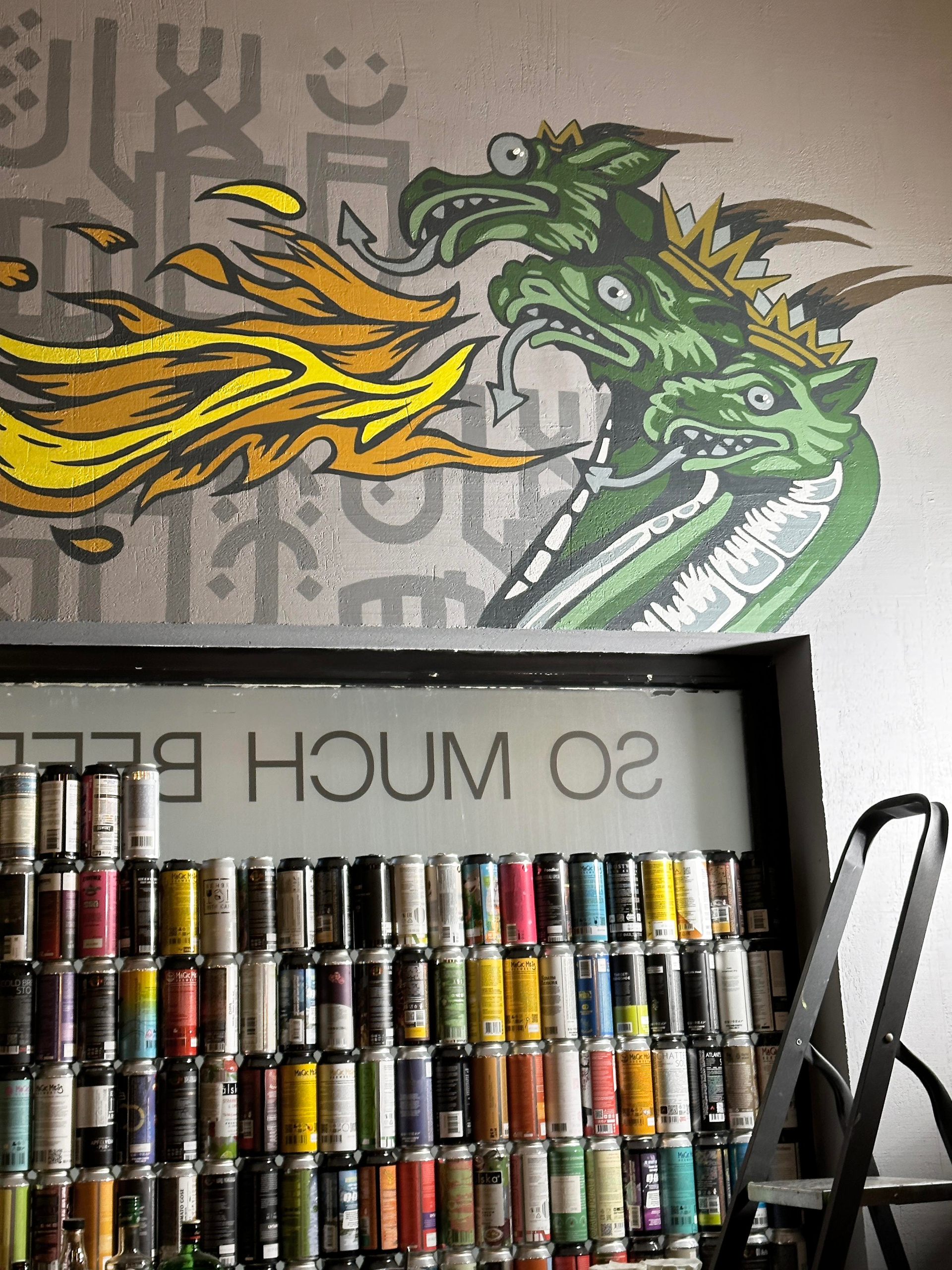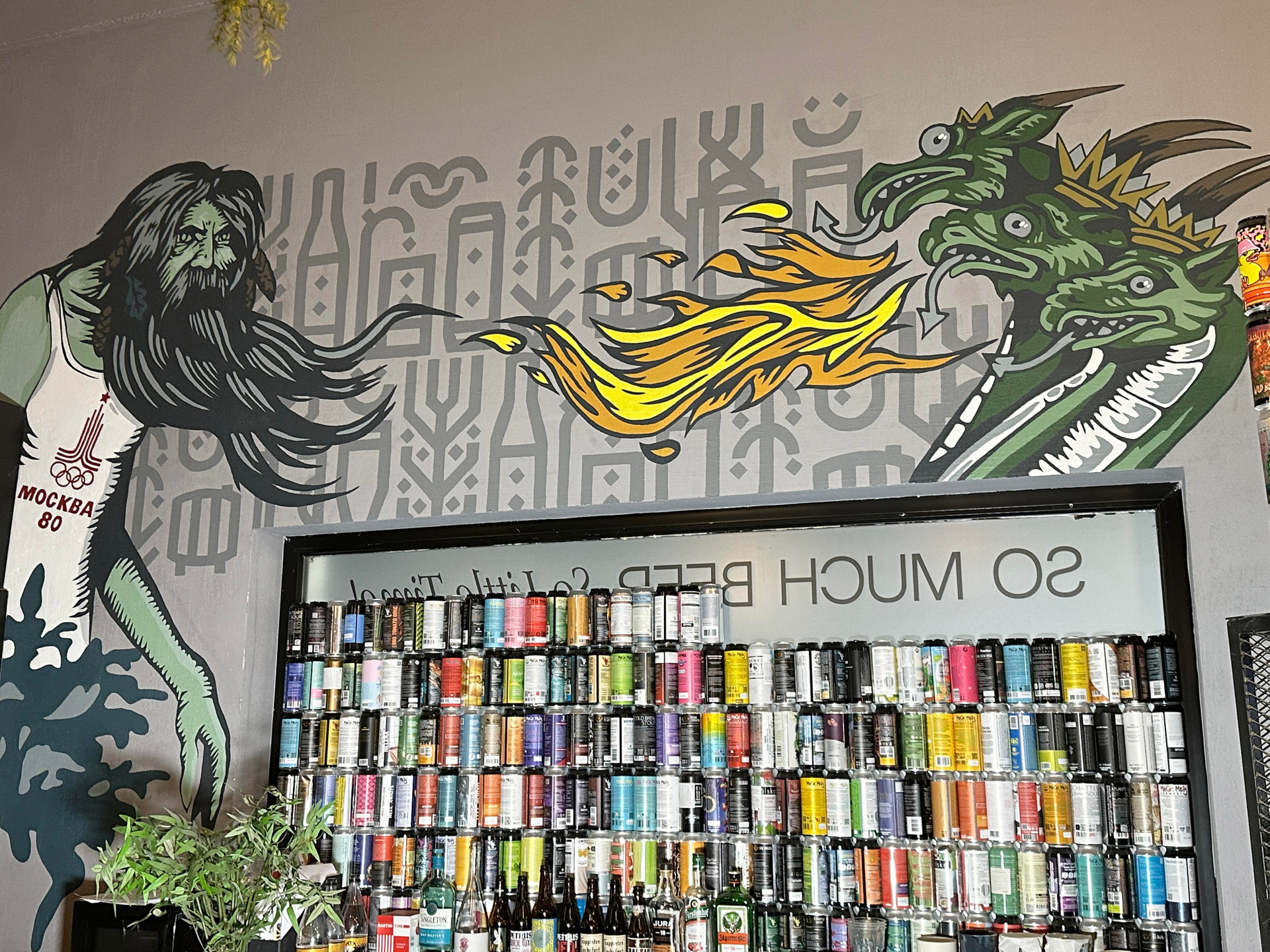 Роспись для бара ONETAP в городе Санкт-Петербурге в пространстве Севкабель порт по адресу Кожевенная линия, 34. Для росписи были выбраны персонажи пивоварни Brewlok из Воронежа. Они известны своей продукцией направленной на сказочную литературную тематику. Для акцентного изображения были выбраны два популярных персонажа Леший и змей Горыныч. А фоновым рисунком декоративный паттерн о процессе пивоварения.