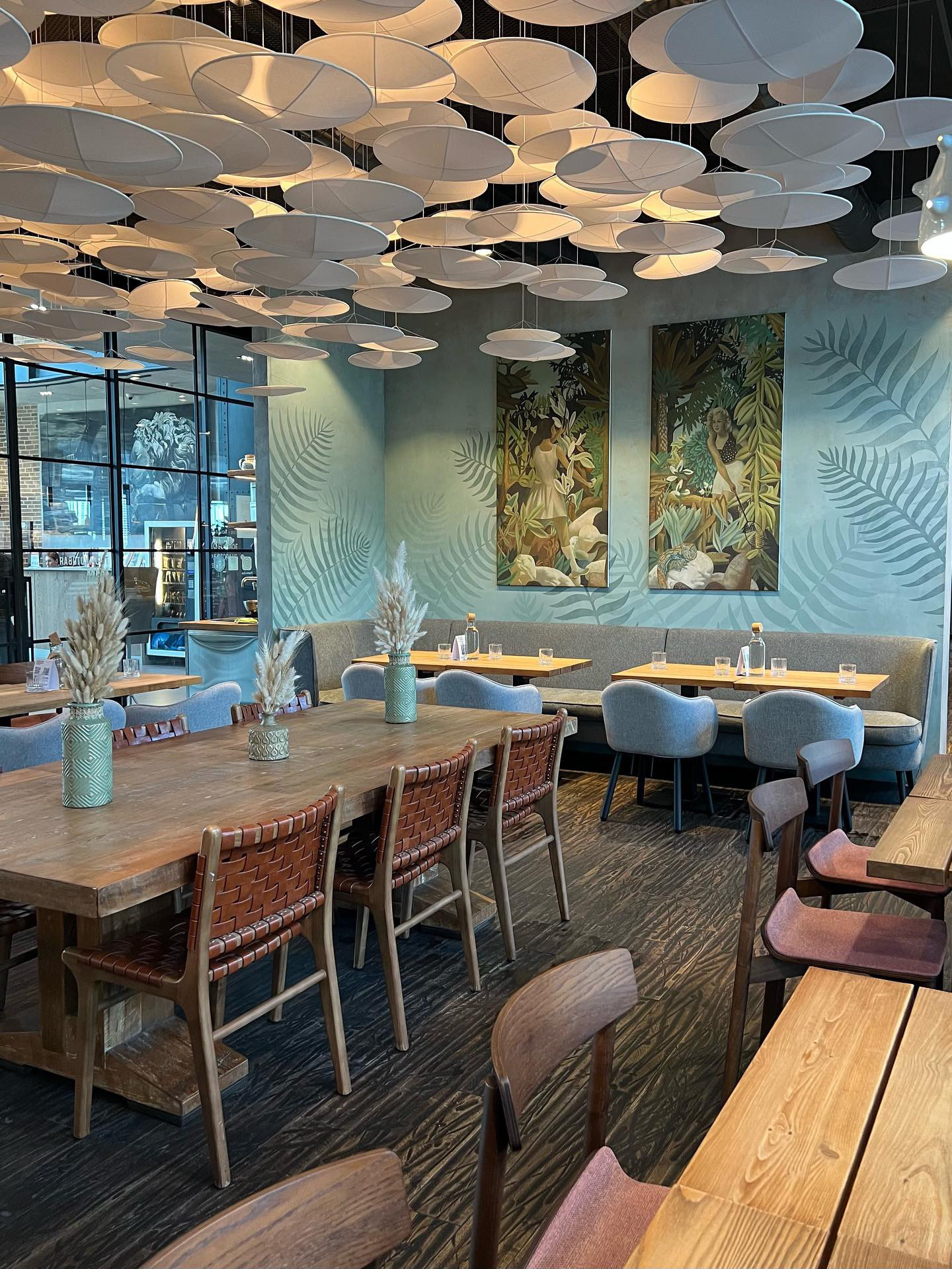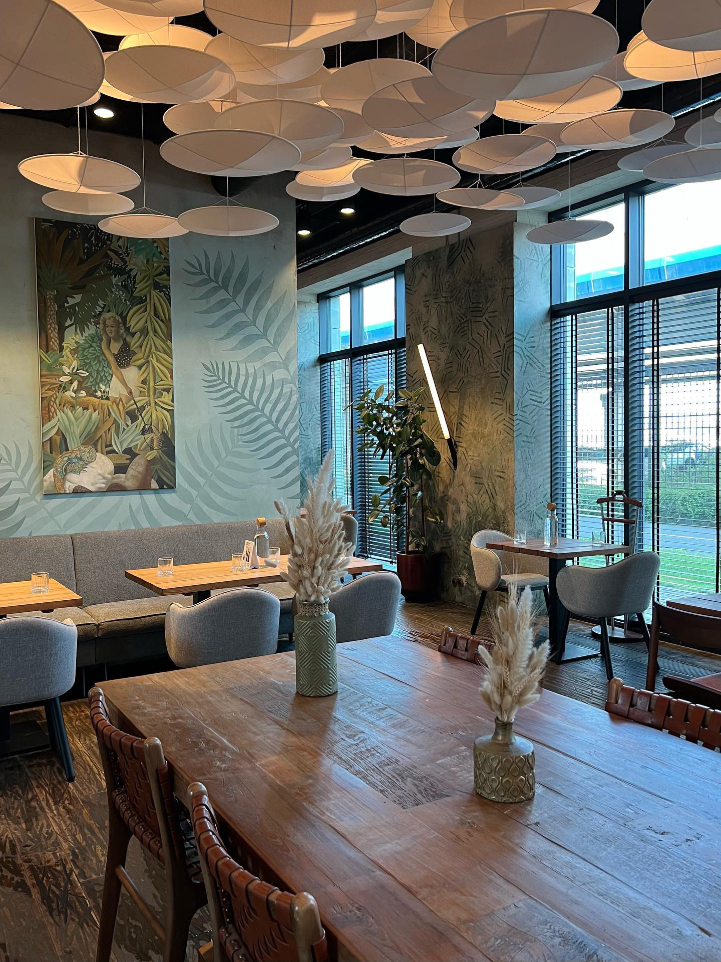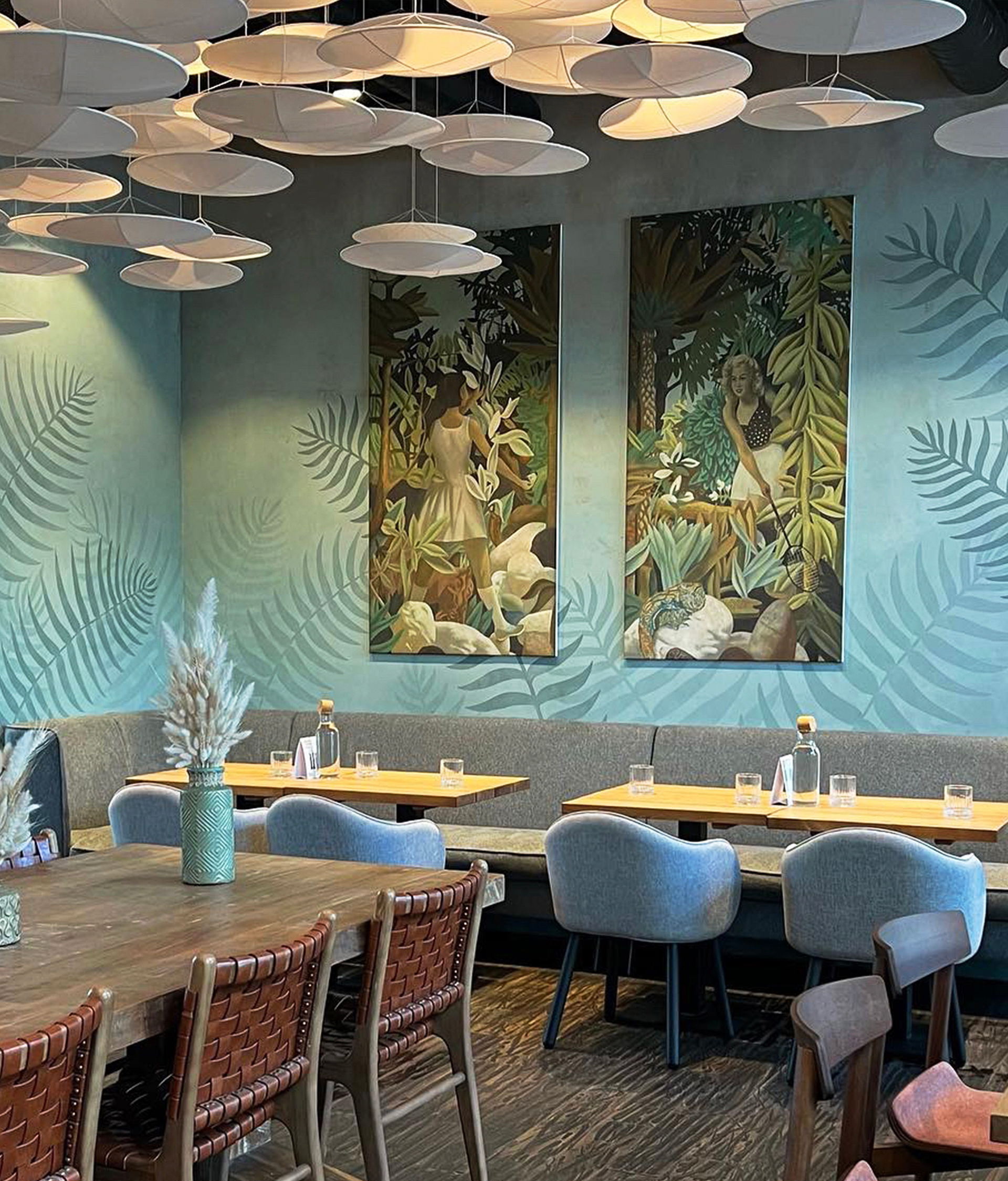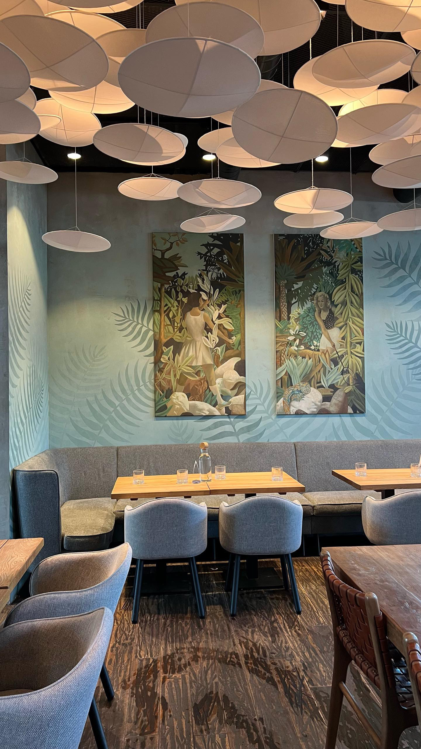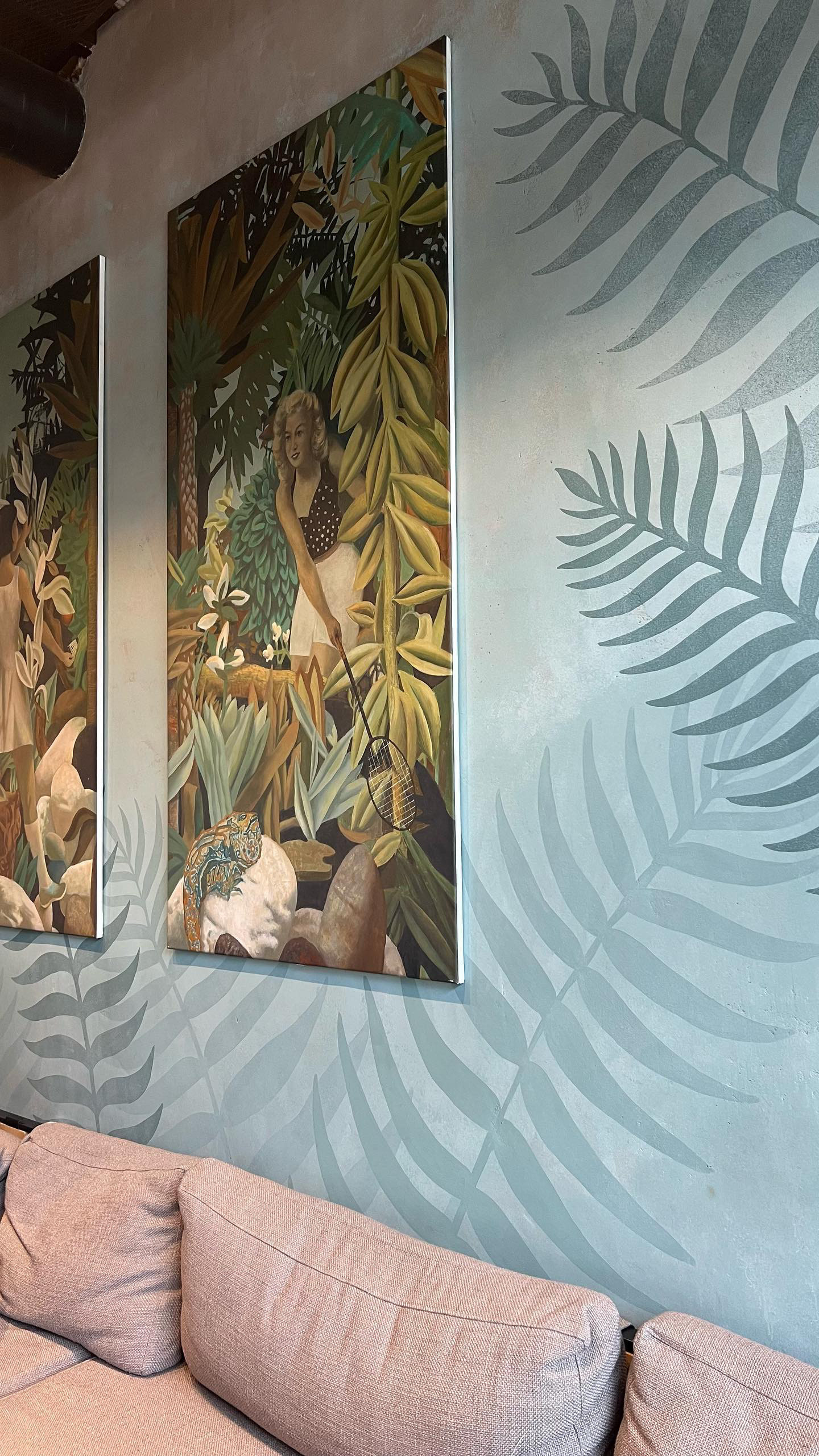 Роспись центральной стены в ресторане «Bestiе» по адресу наб. Макарова, 60, Санкт-Петербург. Помещение располагается во входной группе аппарт отеля «Dосklands». Фактура стены была испорчена гостями в связи с чем потребовалось декоративное решение, которое в последствии не даст посетителям испортить общий вид ресторана. Дизайн росписи был выбран в пастельных тонах для того, чтобы нейтрально вписаться в интерьер. Декоративные листья изображенные на стене стилистически соединяют обе картины в единый арт объект. Работа была выполнена за две ночи. В росписи была использована акриловая краска премиум качества. Площадь работы составляет 17 м².