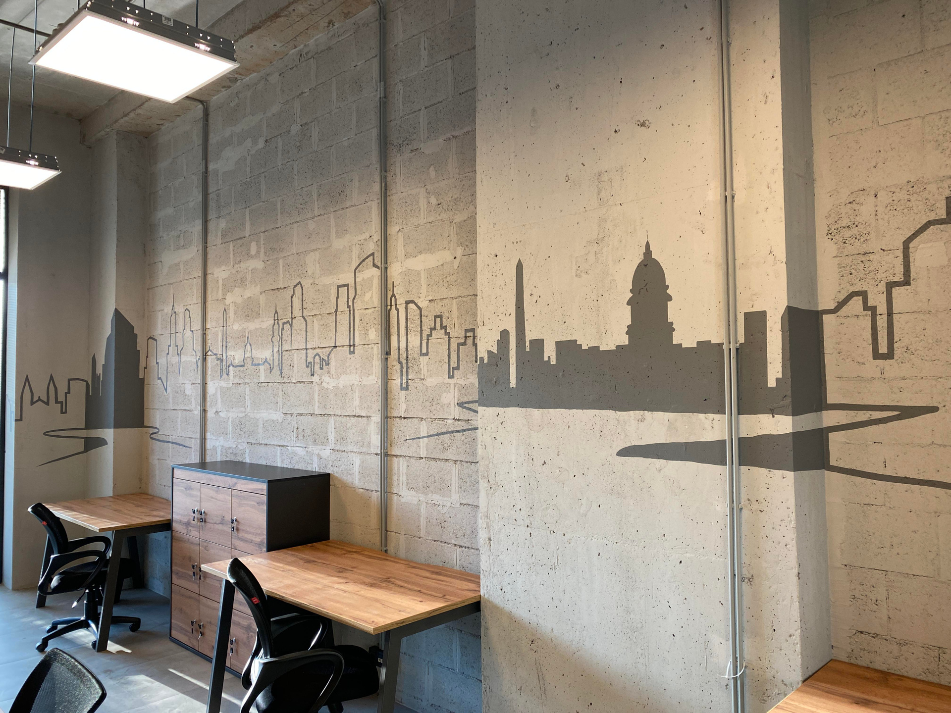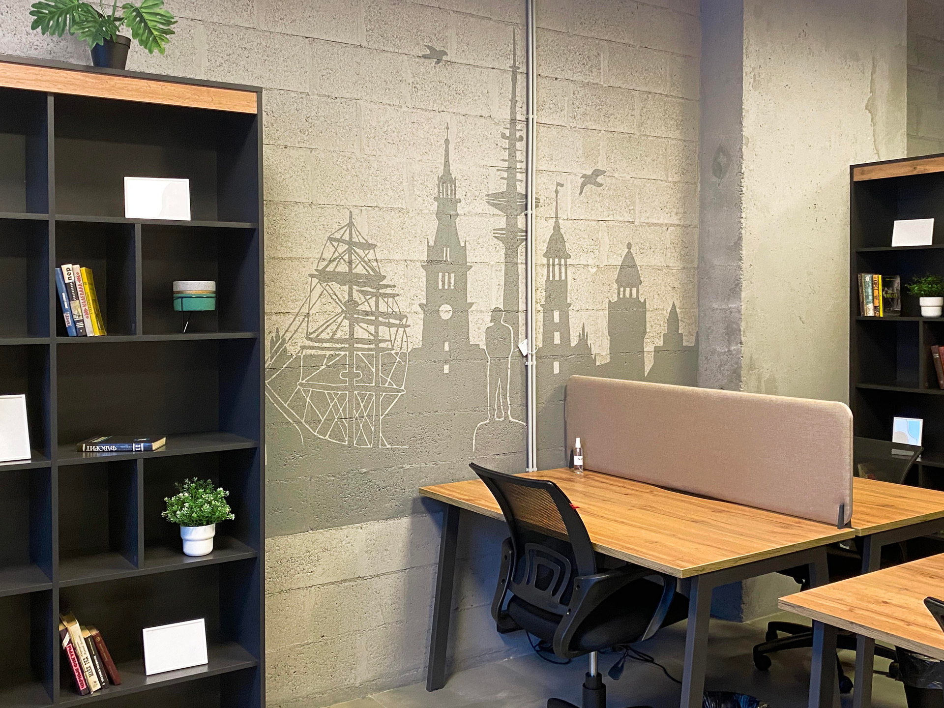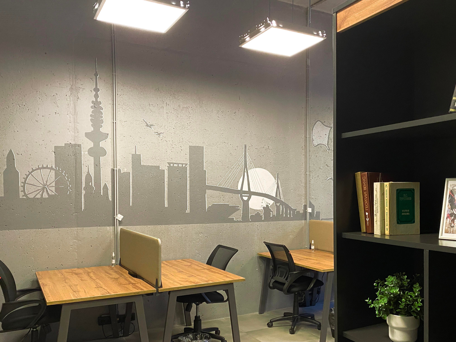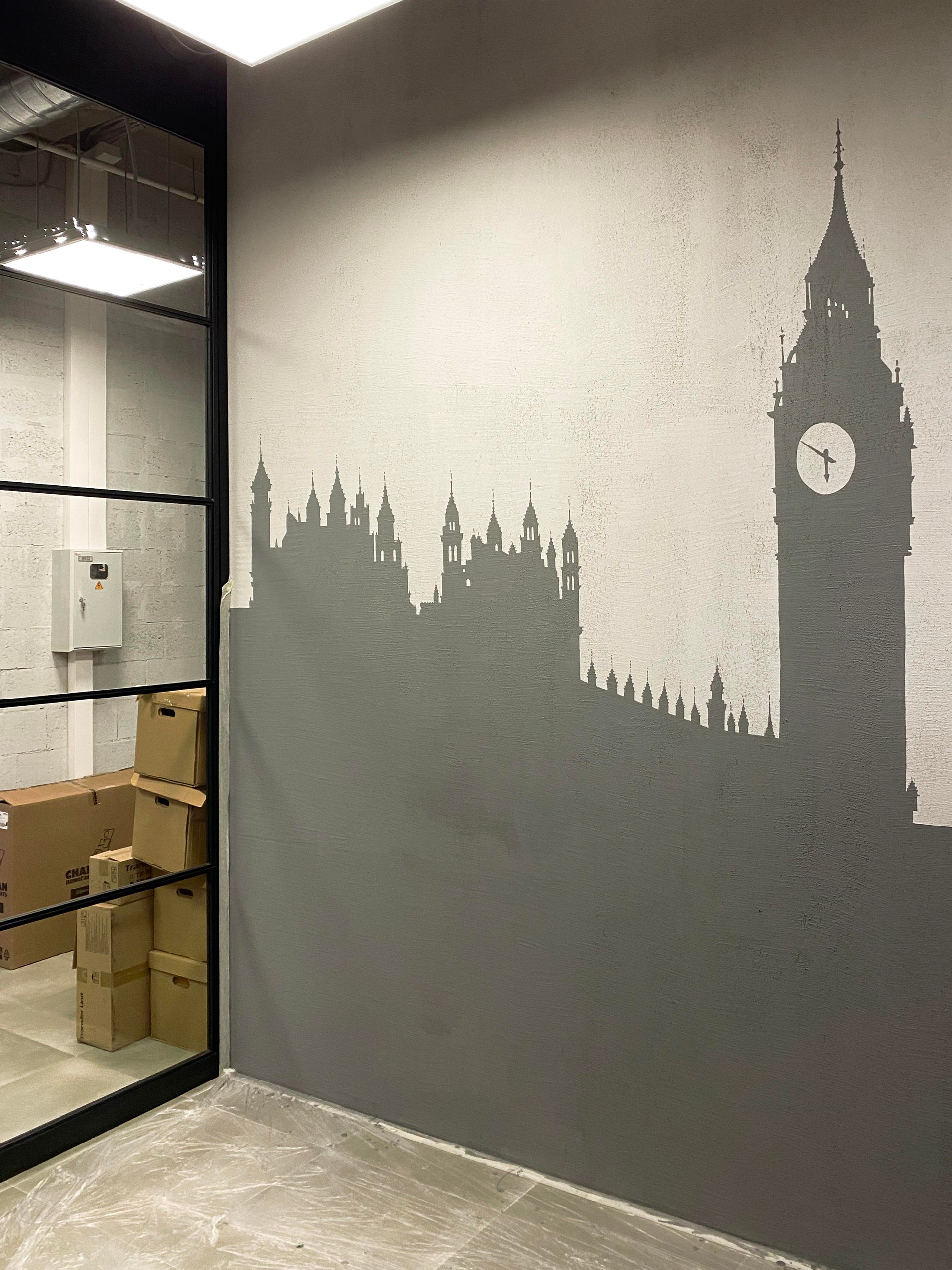 Разработка концепции коворкинга PAGE по адресу наб. Макарова, 60, Санкт-Петербург. Группа помещений располагается на первом этаже аппарт отеля «Dосklands». Уникальность в том, что каждая зона относиться к определенному городу, который содержит лучшее архитектурное предложения по развитию портовых доков. На стенах кабинетов расположены монохромные архитектурные фасады главных достопримечательностей городов, таких как Гамбург, Ротердам, Лондон, Буэнос-Айрес и Копенгаген. Что даёт дополнительную навигацию по рабочему пространству. Монохромное изображение создает необычный интерьер, визуально расширяя пространство, который не отвлекает от работы гостей коворкинга. Благодаря такому решению, можно добиться единой стилистической концепции и сделать рабочее пространство более современным. Роспись была создана акриловой краской премиум качества. Площадь росписи составляет более 100 м².
